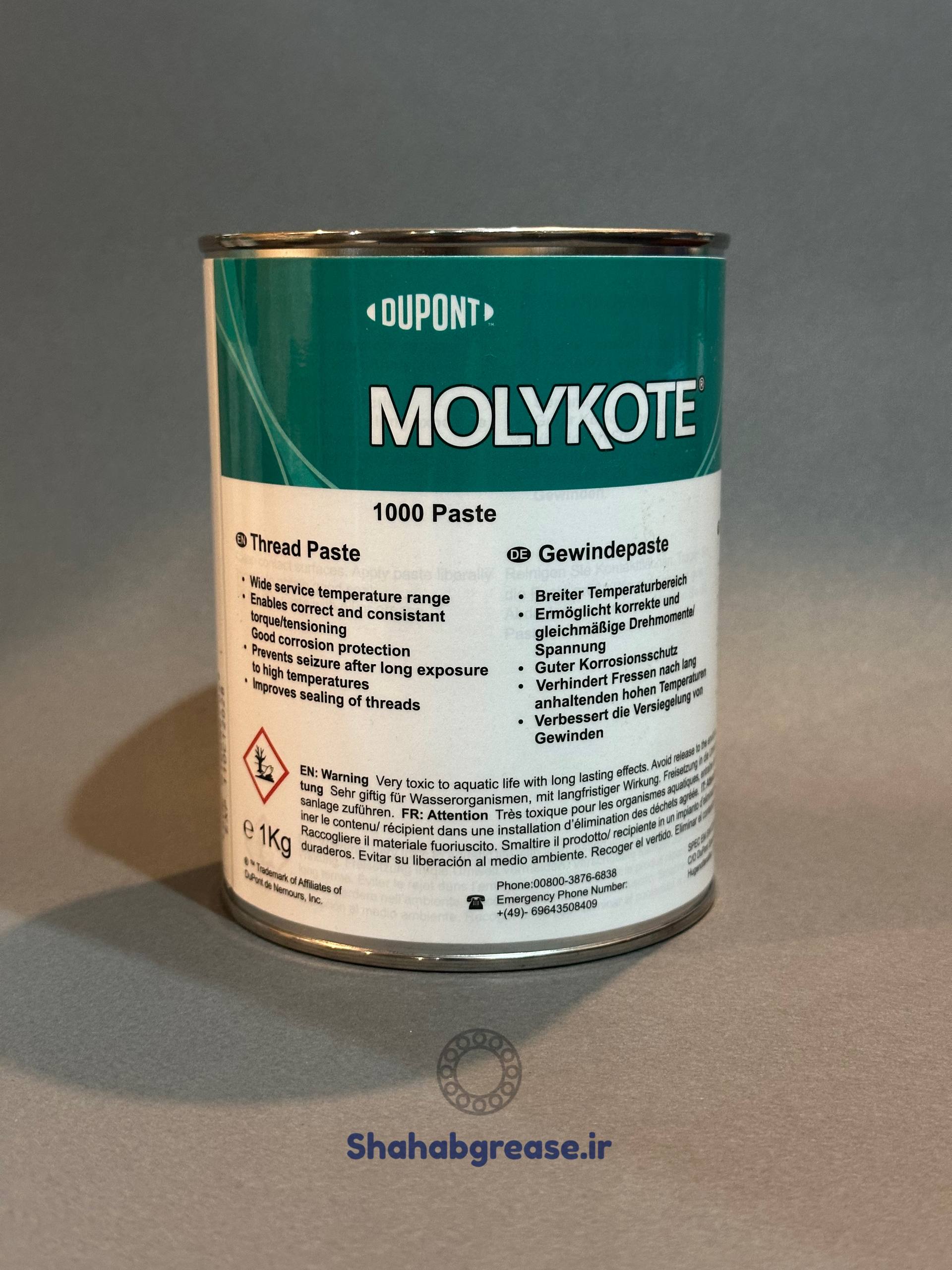 گریس مولیکوت ۱۰۰۰ یک روانکار صنعتی خمیری شکل و بسیار باکیفیت است که توسط مهندسین کارخانه خوشنام مولیکوت آلمان (DuPont MOLYKOTE) به تولید رسیده است. این محصول که به صورت جامد خمیری شکل و در بسته بندی تک جزئی عرضه میشود، به طور تخصصی برای روانکاری اتصالات فلزی و قطعات بسیار حساس صنعتی که در دمای بسیار بالا کار میکنند، طراحی شده است.
